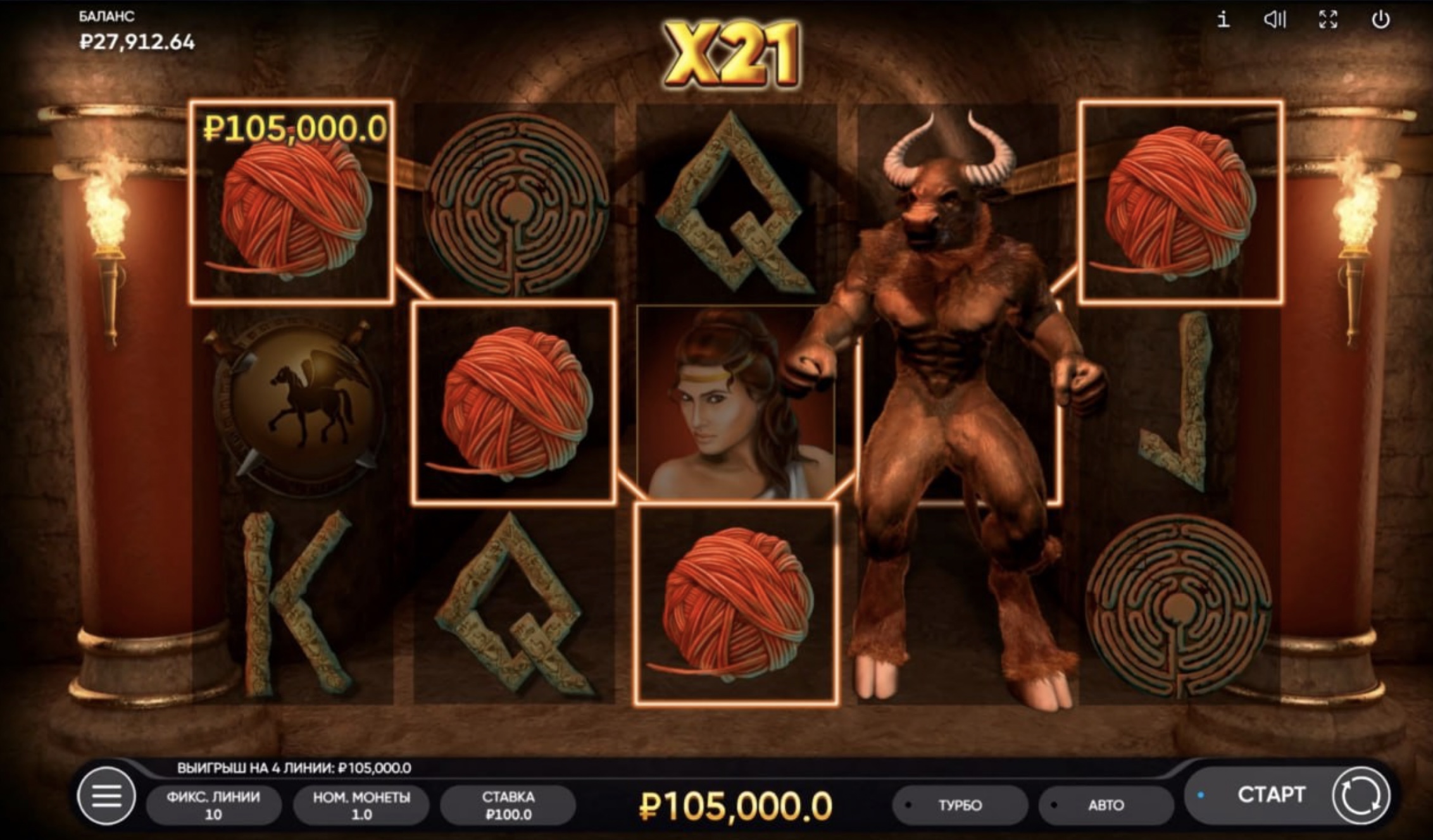 Minotaurus – игровой слот, посвященный древнегреческой мифологии. Вы должны помочь Тесею победить Минотавра и получить свою призовую сумму. При этом вы можете наслаждаться прекрасной графикой и захватывающими музыкальными темами. Этот слот содержит 5 барабанов и 20 линий выплат. Минимальная ставка составляет 0,2 рубля, а максимальная — 100 рублей.